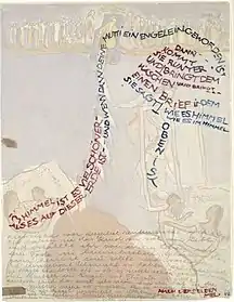 The work includes some two hundred transparencies carrying text intended to overlay their associated gouaches. The examples illustrated are typical. It is the closing gouache of Scene 1 of the Prelude and depicts the fictional Charlotte Kann (representing Salomon herself) in bed with her mother Franziska, who is telling Charlotte how wonderful it is in Heaven and how one day she (Franziska) will go there and turn into an angel and leave a letter for Charlotte on her windowsill describing life in Heaven.
