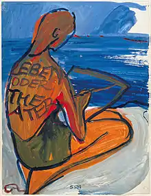 Because of the nature of the work, it requires three images adequately to convey it. The image on the left is of the last page (verso) of four pages of densely packed text, carried on both sides, that conclude the epilogue. The center image is the final example of the transparent overlays that occur throughout the work, while the rightmost image is the gouache most closely associated with the work, depicting Charlotte Salomon kneeling before the sea with brush and paper in her hand and the words Life or Theater inscribed on her back.