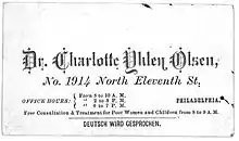 Charlotte Yhlen returned to the United States, where she worked as a physician at the Woman's Hospital of Philadelphia and then with her own practice. In 1874, she married the Norwegian engineer Tinius Olsen. She retired in 1889.