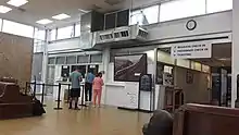 The current station's exterior incorporates dark brown brick and large, angled concrete panels covered in pebble-dash. Interspersed with these heavy, solid elements are transparent walls of glass, which—coupled with clerestory windows beneath the roof—allow ample natural light to flood the 1,200-square-foot (110 m2) waiting room. In keeping with the aesthetics of Mid-Century Modern architecture, the station has minimal applied ornamentation.[5]