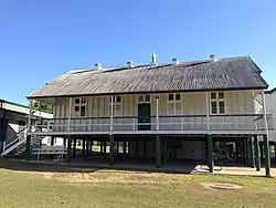 A period of marked experimentation in school design occurred between 1893 and 1914, with a primary focus on improving the natural light and ventilation of classroom interiors.[34] Various combinations of roof ventilators and ducting; ceiling and wall vents; and larger windows of varying sill heights and dormer windows were trialled. For timber-framed buildings, single-skin construction was favoured for its heat dissipation ability and economy. Often the building was lined on the interior rather than exterior, providing a smooth, cleanable surface that provided better interior light. The resulting externally-exposed stud framing was protected from the weather by wide verandahs, which had the added benefit of shading the building and providing makeshift teaching space. The introduction of highset buildings began in the late 1890s, providing better ventilation and additional teaching and covered play space underneath. This was a noticeable new direction and this form became a characteristic of Queensland schools. A number of ventilating techniques were introduced at this time. One of note was a continuous ventilation flap on the wall at floor level. This hinged board could be opened to increase air flow into the space and, combined with a ceiling vent and large roof fleche, improved internal air quality and lowered internal temperatures effectively.[33][1]