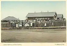 By January 1884, there were two state schools, a convent school, and two small private schools in Charters Towers; with a total of 924 children, including 160 at the State School for Boys, and 421 at the State School for Girls and Infants.[23] In October 1885 tenders were called for additions to the "Girls" and Infants' State School', and the Ferguson building was extended to accommodate infants' classes, in an additional timber wing at the south end.[24] By December 1885 the Girls' and Infants' School had an average attendance of 690 students; while the Boys' School at the original site had an average attendance of 250.[25] In mid-1889 the girls' and infants' schools were separated, although they both remained in the Ferguson building.[26][1]