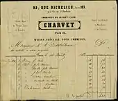 Charvet shirts were imported into the United States as early as 1853 (See figure right).[100] By 1860, Charvet's shirts turnover was equally divided between luxury bespoke shirts sold in the Paris store and ready made shirts for export, particularly to Russia, Great-Britain and Havana.[101] Also, following the custom of the time, designs and models were sold to American stores, to be locally reproduced.[102][103] In the 1920s, Charvet's name was associated in the United States with linen fabrics in "startingly floreated" patterns, used for shirt bibs and cuffs.[104] Nevertheless, into the middle of the 20th century, Charvet was selling only bespoke shirts in the Paris store.[n. 7]