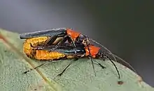 Chauliognathus tricolor, the Tricolor soldier beetle, is a species of soldier beetle in the family Cantharidae.[1][2][3][4][5][6] It has a flattened body between 6 and 16 millimeters long with a prominent red-orange stripe behind the black prothorax. The abdomen is yellow-orange but is mostly obscured by the metallic olive green elytra.[7][8][9]