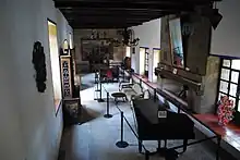 The manor house was originally built by the Marquis of Selva Negra, the first owner of the property, but different parts of the complex date from different times. It is built at an elevation which overlooks the property, although trees block the view of the lake. The house now serves as the entrance to the hacienda and it is surrounded by a number of ash trees that are centuries old.[2][5] Visitors enter a side portal into the inner courtyard. The courtyard fountain, built in 1941, is covered in Talavera plates and tiles. Opposite the fountain is a small chapel. The four flanks of the building enclosing the courtyard feature small watchtowers on the four outer corners. The entrance to the site museum is on the north side. The museum contains photographs, paintings, furniture and other items displayed among the former rooms of the house including the salon, the kitchen, the dining room and one of the bedrooms. Beside the manor house are the remains of other hacienda buildings such as horse stables.[2] To reach the rest of the property, one exits the house into the east garden, which is one of several on the property. This garden contains a large white fountain flanked by two reflecting pools. In this garden, there are a number of paths, including one that leads to the lake and the English style residence.[5]