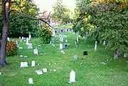 Chelsea Garden Cemetery is located south east of the city's Bellingham Square civic center, and consists of a rectangular parcel about 3.2 acres (1.3 ha) in size. It has a network of paths which wind over the undulating terrain, rising from a low point in the southeast. One of its focal points was originally a man-made pond, located at the lowest point in the cemetery; it was filled in late in the 19th century. Another is the Soldiers Circle at main entrance, where a number of the city's Civil War dead are buried. The cemetery is estimated to hold more than 1,600 burials; due to the transient nature of the Chelsea population over the period of the cemetery's existence, with little historical continuity, it has had a history neglect and vandalism. The fringes of the cemetery were also damaged by the 1908 fire that devastated the city, and destroyed some cemetery records.[2]
