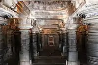 The Keshava temple at Somanathapura faces east and is enclosed in a walled courtyard with a major gate (mahadvara).[19] Outside the walls before the gate stands a tall pillar, which once had a Garuda statue on top, now missing. Inside the gate, to the left are vertical standing inscription stones. These stones have the form of the hero stones, with the top decorated with Hindu iconography as well as miniature reliefs of Keshava, Janardhana and Venugopala. The inscription is in old Kannada. The small entrance mandapa is supported by lathe-carved soapstone pillars.[4][19] The temple is carved from soapstone, a green-grey chloritic schist material that is soft in quarry but hardens when exposed to air. This is not locally available and must have been imported from another part of South India. It enabled the artists to shape and carve out intricate details for the artwork.[20][21]