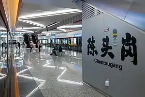 Chentougang station is a station on Line 22 of the Guangzhou Metro that began operations on 31 March 2022. It is situated underground at the Shibi Subdistrict.[1]