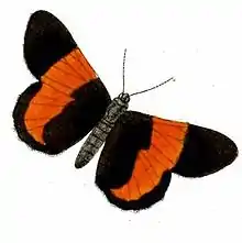 The forewings are black, crossed in the middle by a wide orange band, the apex tipped with white. The hindwings are black, crossed from the costal margin to near the anal angle by a yellow band tapering almost to a point. The underside is the same as the upperside. The head, thorax and abdomen are black.[2]