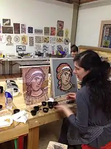 The Chicago Mosaic School was founded in early 2005 by artist Karen Ami, and it quickly became the premier center of education for Mosaic Arts in the United States. Before shifting her focus toward mosaics in her practice, Karen had a long career as a working artist in painting and ceramics, earning her BFA from the Boston Museum School and MFA from the School of the Art Institute of Chicago. In 1993, she took an interest in mosaics and found there were few resources in the United States for artists interested in a serious study of the medium. After several years of independent research and practice, she sought formal instruction in Italy.[4] She connected with established and trained mosaic artists from around the world and invited them to come to Chicago to educate a new generation of students in the United States.[5] Ami served as the president of the Society of American Mosaic Artists.[6] With her background as a ceramicist and formulation in traditional mosaic technique, Ami was inspired by her love of mosaics to establish a hub for learning in Chicago, where expertise of ancient methodology and application could mingle with a contemporary perspective and aesthetic experimentation.