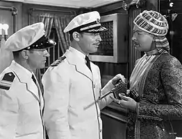 Dolly Portland (Jean Harlow) is Alan's former girlfriend, who Alan later describes at the Captain's table as a "professional entertainer," and travels with her maid. Meanwhile, another of Alan's former loves, aristocratic Sybil Barclay (Rosalind Russell) from Sussex, England boards the Kin Lung. "I am in your hands again," Sybil taunts Alan, and eventually they plan to marry when the steamer docks in Singapore. However, Dolly tries to win back Alan. Meanwhile, Jamesy McArdle (Wallace Beery) is a corrupt passenger, in league with a gang of pirates planning to steal the gold shipment of GBP250,000 gold bullion carried on the steamer.[3] Dolly discovers the plot and attempts to warn Capt. Gaskell against McArdle but he deflects her warnings.