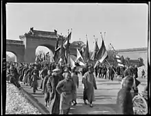 The apparent weak response of the Chinese government led to a surge in Chinese nationalism. On May 4, 1919, widespread student protests began in China, with a movement in Beijing that involved mainly young students, the general public, citizens, business people and other classes, through demonstrations, petitions, strikes and violent confrontations with the government, followed by support from students and workers in Tianjin, Shanghai, Guangzhou, Nanjing, Hangzhou, Wuhan and Jinan. This uprising came to be known as the May Fourth Movement. The fundamental aim of this movement was to get the government to refuse to sign the Treaty of Versailles.[22] Thus, the Chinese delegation at the conference was the only one not to sign the treaty at the signing ceremony.[23]