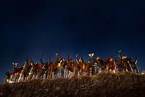 - Q'Apaq Negro: A colonial-era dance, mostly performed by men, remembering the period of slavery for Afro-Peruvians. It features locals with round hats, scarfs around their waistline, blue pants, black masks, black gloves and small Sceptres with black hands. The dance symbolizes both the struggles of slavery; its colorful ornaments and shiny stones represent the strength of black people in colonial Peru gaining liberty.[14]