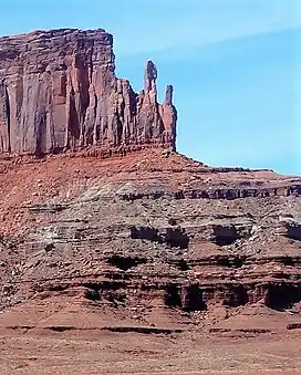Chip and Dale Towers are two 300-foot (91-meter) tall sandstone towers located in the Island in the Sky District of Canyonlands National Park, in San Juan County, Utah. Dale Tower rises to an elevation of 5,620 feet (1,710 meters), whereas the lower Chip Tower is 5,420-feet. Airport Tower is set 2.5 mi (4.0 km) to the southwest, and Dead Horse Point State Park overlook is situated 4.5 mi (7.2 km) to the north-northeast. Chip and Dale Towers are an eroded fin composed of hard, fine-grained Wingate Sandstone, which is the remains of wind-borne sand dunes deposited approximately 200 million years ago in the Late Triassic. This Wingate Sandstone overlays a softer layer of the Chinle Formation. Access to the towers is via the four-wheel drive White Rim Road, and a scramble to reach the base.[3] The top of the towers rise over 1,000 feet above the road in approximately one-half mile. Precipitation runoff from Chip and Dale Towers drains east to the nearby Colorado River.