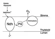 In the year 2002, the discovery of the molecules; plastid terminal oxidase (PTOX) and NDH complexes have revolutionised the concept of chlororespiration.[2] Using evidence from experimentation on the plant species Rosa Meillandina, this latest model observes the role of PTOX to be an enzyme that prevents the PQ pool from over-reducing, by stimulating its reoxidation.[4] Whereas, the NDH complexes are responsible for providing a gateway for electrons to form an ETC.[4] The presence of such molecules are apparent in the non-appressed thylakoid membranes of higher order plants like Rosa Meillandina.[5][2][3]