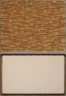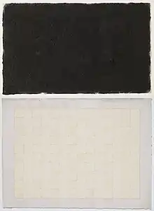 In addition to these repetitive mark-making tasks which imparts a physicality to the painting, it also uses the hanji paper to create "planar conditions." This is done by cutting a white hanji paper sheet into a long band which is dipped in ink and pasting horizontally. "We used white hanji instead of white paint. Cutting and pasting into bands is a variant of square division. By using Korean paper instead of paint, black sides by ink were needed. At the same time, the attempt to bring it together continues, eliminating the relationship between 'ground' and 'image'."[5][6]