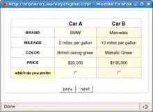 - Alternatives: A number of hypothetical alternatives, Car A and Car B in this example. There may be one or more Alternatives including the 'None' Alternative.