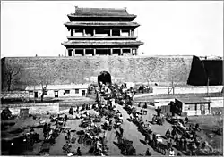 During the Yuan dynasty, the gate was called Wenmingmen (文明門). Because the residence of the Mongol prince Hada was located close by, the gate was also popularly known as Hadamen (traditional 哈達門, simplified 哈大門) or Hademen (traditional 哈德門, simplified 哈德门).[1] The name Hademen survived well into the twentieth century, and was even the name of a popular cigarette brand. The Hademen Hotel now overlooks where the gate once stood. To the east of Chongwenmen, the Ming City Wall Relics Park has the best preserved remaining section of Beijing's Ming city wall.