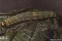 The caterpillar is green with a black head. The adult is a small, light brown moth.