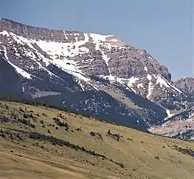 Choteau Mountain is composed of sedimentary rock laid down during the Precambrian to Jurassic periods. Formed in shallow seas, this sedimentary rock was pushed east and over the top of younger rock during the Laramide orogeny.[4] The Lewis Overthrust extends over 280 miles (450 km) from Mount Kidd in Alberta, south to Steamboat Mountain which is located 46 miles south of Choteau Mountain, which places Choteau Mountain within the southern part of the Lewis Overthrust.[5]