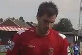 He started 2002–03 well, taking his place in the team due to injuries to other players.[25] He made his first appearance in the opening match, a 1–1 draw away to Macclesfield Town on 10 August 2002, with chairman John Batchelor claiming Smith had a "wonderful game and if we can get that sort of attitude from everyone in the team we won't have any problems".[27] Smith was dropped to the bench for a 1–1 home draw with Wrexham on 29 October 2002 due to a change in formation, having started every match in 2002–03 prior to this match, although he did play as a 48th-minute substitute.[28] He suffered a hamstring injury in early-November 2002,[29] making his return in a 1–0 victory away to Rochdale on 23 November.[30] Smith received his first red card of 2002–03 for a second bookable offence in a 1–1 home draw with Hull City on 28 December 2002, resulting in a one-match suspension.[31] This meant he missed York's match against Torquay on 11 January 2003, and after a short spell on the sidelines returned in a 2–1 home win over Macclesfield on 2 February.[30][31][32] Smith finished 2002–03 with 39 appearances for York,[30] and was described by the Evening Press as the "surprise star of the season".[33] Despite being in outstanding form and becoming a fans' favourite,[34] he was not offered a new contract with York at the end of 2002–03 by Dolan, although he hoped to still to have a future at the club.[35] This decision was reversed by newly appointed player-manager Chris Brass, and Smith signed a new one-year contract in July 2003.[36]