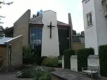 The majority of the Victorian building was destroyed by fire in 1982, almost the only fabric remaining from the 19th century being the tower. A new church building, designed by Brian Drury, was erected on the cleared site, providing a hexagonal worship area that connects directly to an entrance lobby and to the Goodliffe Hall, a 1960s structure that also survived the conflagration. The new building is of reinforced concrete structure, with timber roof trusses and is entered from Highland Road.[9]