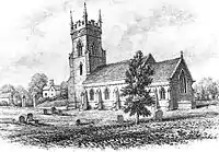 The 34-acre site was given in 1844 by Richard Hinckley the owner of Beacon House and its surrounding estate grounds. The site of the church would be approximately 500m south of Beacon House at the edge of the estate grounds and visible to the Hinckley's from their home. The cost of building the church was provided by Ellen Jane Hinckley, the wife of Richard Hinckley.[1] The church was built with local red sandstone in a Decorated Gothic Revival style under the design of Thomas Johnson of Lichfield. When the church was completed in 1847 in consisted of a chancel, nave and west tower containing a bell cast in 1845 by C. G. Mears of London.[1]