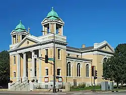 The building's principal facade is symmetrical and features a Classical pediment supported by Ionic columns and pilasters, flanked by bell towers. An office wing, which currently houses the Saint Paul Area Synod of the ELCA, was constructed in 1962–63.