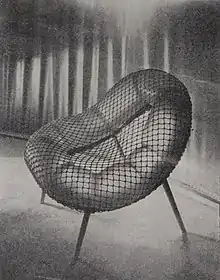 - an inflatable plastic chair, both comfortable and sturdy, which collapsed to the size of a briefcase, designed for travellers; it is now in the permanent collection at the Department of Architecture and Design, Museum of Modern Art. In 1944 The Times defined it "a chair whose fish-net seat (draped over a pneumatic, plastic doughnut) was surrealistically adapted to the most unsurrealistic sitter".[1][5]