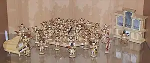 Christmas angels are small wooden figures portraying angels often playing an instrument. They can be arranged to an entire orchestra. The origins of artistic angel carving lie in the Ore Mountains where the angels are an integral part of Ore Mountain folk art.
