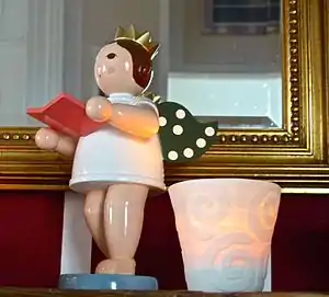 Christmas angels are always made with wings to accentuate their heavenly character. They can be lacquered colorful or in natural wood colors.[2] Among the colorful angels the color and decoration of the wings indicate the respective manufacturer who uses these features as a kind of trademark.