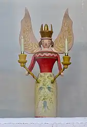 Besides the for the Ore Mountain woodcraft since the end of the 18th century central figure of the miner, angels as light bearers became increasingly widespread. The Ore Mountain folk art angel figures excel in their great depiction as a small-size version.[1] The first carved angels can already be found at the end of the 15th century.