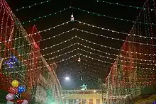 Christmas lights and banners may be hung along streets, music played by speakers, and Christmas trees placed in prominent places.[36] It is common in many parts of the world for town squares and consumer shopping areas to sponsor and display decorations. Rolls of brightly colored paper with secular or religious Christmas motifs are manufactured to wrap gifts. In some countries, Christmas decorations are traditionally taken down on Twelfth Night.