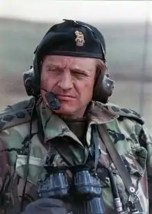Wallace's regimental service in the Royal Green Jackets concluded with command of the 3rd Battalion in Germany and Northern Ireland from 1983 to 1985.[2] While on exercises at Celle, British Army of the Rhine, he was sharing a tented trailer with his second-in-command when a gas lamp exploded and set the accommodation ablaze. Wallace was badly burned on the hands and face while getting his brother officer to safety.[2] He became commander of 7th Armoured Brigade in 1986, Director of Public Relations (Army) in the Ministry of Defence in 1989 and General Officer Commanding 3rd Armoured Division in 1990.[2] He went on to be Commandant of the Staff College, Camberley, in 1993 and then established the Permanent Joint Headquarters (UK) at Northwood during a tour from 1994 to 1996, before becoming the UK's first Chief of Joint Operations in 1996.[2] He was appointed a Knight Commander of the Order of the British Empire in the 1997 Birthday Honours[7] and retired, aged 56, on 20 June 1999.[1][8]