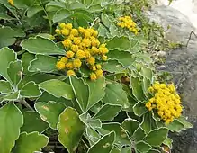 It is a showy plant, blooming in late fall and producing yellow heads of flowers.[1] It was introduced into U.S. gardening catalogs in 1989,[4] and has been in cultivation in Japan since an early date.[3]