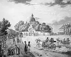 - Standing on the northern side is a neo-Gothic gate - the bell tower from the first half of the 19th century is decorated with the coat of arms of the Ossolińskis, who followed the Lubomirski's as Czerniaków's owners.