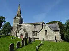 The stone building has a slate roof. It consists of a nave, north aisle, south porch, three-bay chancel and vestry with a west tower and spire supported by buttresses.[1] The tower contains three bells hung as a chime.[4]