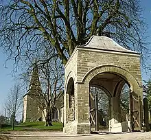 The lychgate is constructed from carved stone, dates from the 18th century, and has its own Grade II* listing. Its design is unusual, with a domed roof capped with a finial, and open arches set into each wall.[7]