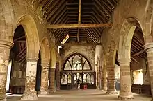 The interior is "a shock to the modern visitor who encounters an uncluttered medieval interior dominated by the arcades and roof".[5] The unfurnished nave demonstrates the "strong early thirteenth century arcades to the full".[6] The architectural historian John Newman describes the font as "a strange piece, an octagonal bowl with a thick circular stem".[6] The choir stalls and the pulpit are 19th century.[6] A stained-glass window in the chancel commemorates John Etherington Welch Rolls.[6] In the transept is an unfinished memorial to a knight, dating from the late 13th or early 14th century, "a rare survival of great technical interest".[6]
