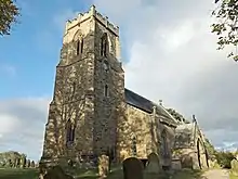 The church consists of two aisles either side of the nave, an east facing chancel, with a vestry to the north, and a porch to the south near the tower, which is at the west.[6] Most of the internal fabric of the building is 12th century, whilst the walls are 14th century, though both the porch and the tower are modern additions.[4] Most of the architecture is Early English, part from the chancel which is in the Decorated style.[11] The church is largely built of sandstone with Westmorland slates on the roof.[12] It is said that its design and use of stone was due to it being in the patronage of St Mary's Abbey in York, as its appearance was quite lavish for a remote parish church.[13] The tower was erected in the 19th century to replace an older tower dating back to 1577.[14] This tower also replaced an even earlier steeple that was blown down during a storm.[15] Dates regarding the destruction of the tower are varied with some stating 1577 and others 1672.[16] The Victorian renovation of the tower gave it a pyramid style roof which was seen as a bad decision architecturally in comparison to the church; one geographical diarist described it as "a deformity".[17]