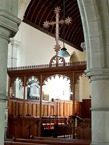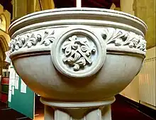 The font and pulpit, designed by the architect and sculpted by Charles Mawer of Leeds,[16] are made of Caen stone, and were paid for by Lady Ingilby. The nave and chancel originally had plain brass gas lamp standards made by Hardman's Works, and there was hot-air heating apparatus supplied by Grundy. The books were given by Mrs and the Misses Lloyd of Hazelcroft. Plate used for communion service was given by Mrs W. Strother, and the chairs in the chancel were given by Mr H. Cautley. The surplices and linen were given by the vicar of Killinghall Reverend R.K. Smith and his wife.[1] Thomas Strother presented the altar in memory of his mother who died in 1863. Dinah Cautley (d.1910) paid for the oak chancel screen in 1905.[15]