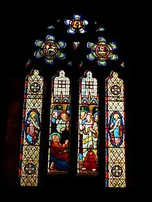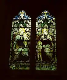 The two-light window at the east end of the north aisle represents Mary and Martha of Bethany, mentioned in Luke 38–42. In that story, Mary is interested in spiritual matters, whereas Martha prefers to do practical work. Thus Martha has a housekeeper's attributes of a spinning wheel and a purse at her waist, while Mary is praying and reading the Scriptures. This window is dedicated to Ann Mitchell, the village postmistress, by her husband.[15][23] The three-light window on the north aisle carries the theme of evangelism and music. It shows King David in the centre light, playing music. The left-hand light carries the words, "Their sound is gone out unto all lands," and the right-hand light says "and their words into the ends of the world." This is a translation of the 4th and 5th lines of Psalm 19, as it appears in the Book of Common Prayer: day 4, morning prayer. The men on either side of David are both saints with halos, and churchmen, wearing mitres. The dedication for this window is missing, but it was said by a local newspaper to have been given by William Clapham Cautley,[1] and that it is dedicated to George Thomas Woods of the Order of Saint John. Woods was church organist for 24 years.[15][23]