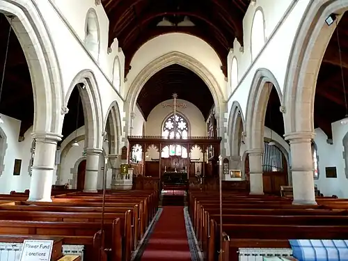 Between the nave and the north and south aisles are two arcades each of four doubly-chamfered arches, supported by circular columns with octagonal capitals. The chancel floor is three steps above that of the nave. It contains choir stalls designed by the architect William Swinden Barber on either side, and in a 1905–1908 chancel reordering these were augmented by two clergy seats and two prayer desks for the choir. The original choir stalls were described in 1880 as being "plain but very solid construction", like the nave pews which were also designed by the architect. On the south side of the chancel is the organ chamber, and on the north side is the vestry which has access through the north wall and into the chancel. The chancel arch was built "as lofty as possible", being the "chief internal feature of the structure". All the woodwork is made of pitch pine, and was originally treated or varnished to appear as close as possible to its natural colour, although the roof timbers looked warmer than the pews when new. The nave is 56.5 feet (17.2 m) by 20.75 feet (6.32 m), and the north and south aisles are 56.5 feet (17.2 m) by 9.66 feet (2.94 m). The chancel is 31.25 feet (9.53 m) by 19 feet (5.8 m). The organ chamber contained no organ at first, when it measured internally 16.5 feet (5.0 m) by 10.5 feet (3.2 m). At the consecration, a harmonium was used in default of the absent organ,[1] and the church still contains a harmonium which may date back to 1880.