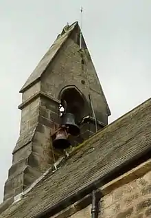 The bellcote contains two bells. The larger one, original to the church and measuring 20 inches (51 cm), was founded in 1879 by Mears and Stainbank. It is hung for use with a bellrope, being in its original position within the bellcote, with a full metal wheel. The smaller one is connected to the clock, which as of 2016 was awaiting repair. This bell measures 14 inches (36 cm) and was founded by John Taylor of Loughborough, possibly in the 1930s when the turret clock mechanism was installed. It has been added at a lower level on the east side of the bellcote, and is struck by a clock hammer. Both bells are inscribed with the maker's name, and the larger one has the date 1879.[14] The clock bell, clock face and turret mechanism by Potts of Leeds was donated by the daughters of George Lewis, who died aged 91 in 1932, having served as churchwarden for 41 years.[15]