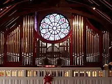 In addition to the organ and the carillon, the church's current building, built in gothic style around 1925, features 28 stained glass windows (the oldest of which dates back to 1895) which feature, among other things, the Ascension of Jesus Christ (in a large window over the altar), the Ten Commandments, the parable of the Good Shepherd, the parable of the Lost Son, and the "war window" where a candle is lit in remembrance of the Iraq war. Many have gone to pray at this window for loved ones involved in the war.[3]