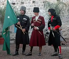 Israeli Circassians in traditional ceremonial clothing with the Circassian national flag, 2010