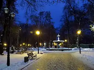 It was established in 1743 by Francesco Bartolomeo Rastrelli as the Tsar's Park. In 18081878 by architect Somonov there were built café with a dance hall, gallery and balcony. In 1863 some French entrepreneur converted a portion of the park (known as the Rose Valley) into a recreational institution under a name Shato-de-Flyor (French:Chateu de Fleur). In 1978 there was established the Russian Drama Society. At the same time, bigger part of the park became restricted to visitors under government administration. In 19091912 through the park was laid the Peter's alley over which in 1910 was established a park bridge. The park bridge today connects Khreshchatyi Park with the City Park.