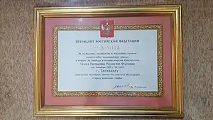 - ↑ "Russian President Dmitry Medvedev presented the certificate conferring the title of City of Military Glory title to the Mayor of Taganrog". taganrogcity.com. February 24, 2012. Retrieved February 24, 2012.