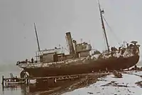 She was sold to Quincy Lumber Company, of Quincy, Massachusetts, for transporting coal and potatoes between Massachusetts and Prince Edward Island, yet another shaft broke and a motor vessel the Arctic Sealer was chartered to take her to Lunenburg, for repair. On 29 December 1952 while she was on tow out of Yarmouth at Chebogue Point, Nova Scotia, the towing cable snapped, and she was anchored. The tide dropped by 12 feet, leaving her aground on the Chebogue ledge.[8] A cabin stove fell over and a fire broke out, quickly spreading throughout the vessel destroying much of her. In a week her remains slid off the ledge into five fathoms of water.[40][44]