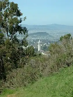 View from Claremont Canyon Regional Preserve. March 13, 2004. The University of California, Berkeley's Sather Tower is in the near view. Behind that is Albany Hill, and the large mountains in the background are the Marin Hills.